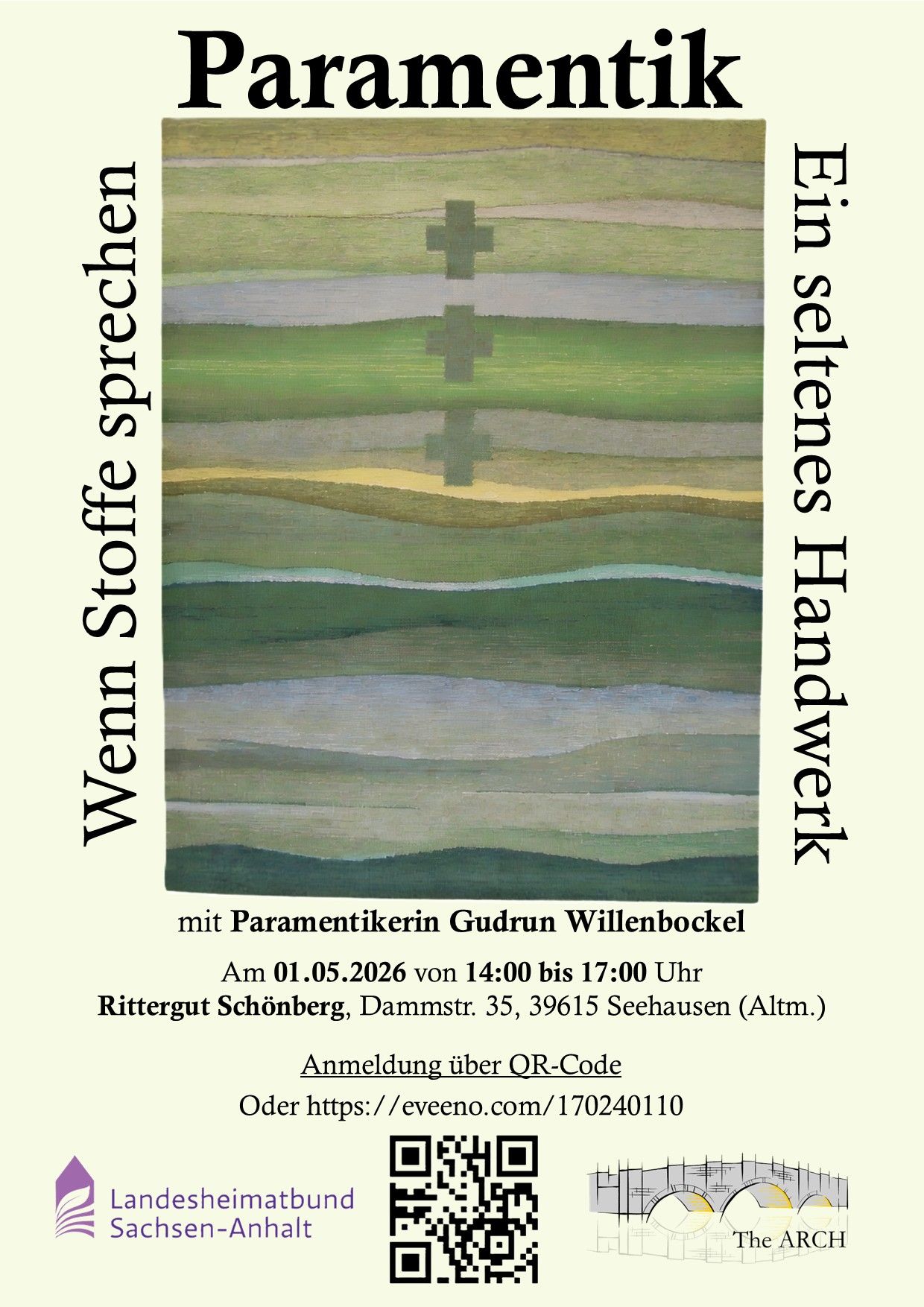 Would you like to get involved? We warmly invite you to join our upcoming workshop “Wenn Stoffe sprechen: When Fabrics Speak – the rare craft of paramentics (ecclesiastical textile arts)” on the 1st May 2026 from 14:00 to 17:00 at Rittergut Schönberg, Dammstr. 35, 39615 Seehausen (Altm.). Together with textile artist and parament maker Gudrun Willenbockel and in partnership with the Landesheimatbund Sachsen-Anhalt, we will explore this beautiful and little-known handcraft that has adorned churches for centuries through the creation of liturgical vestments and altar cloths. Registration is now open via QR code or at https://eveeno.com/170240110.