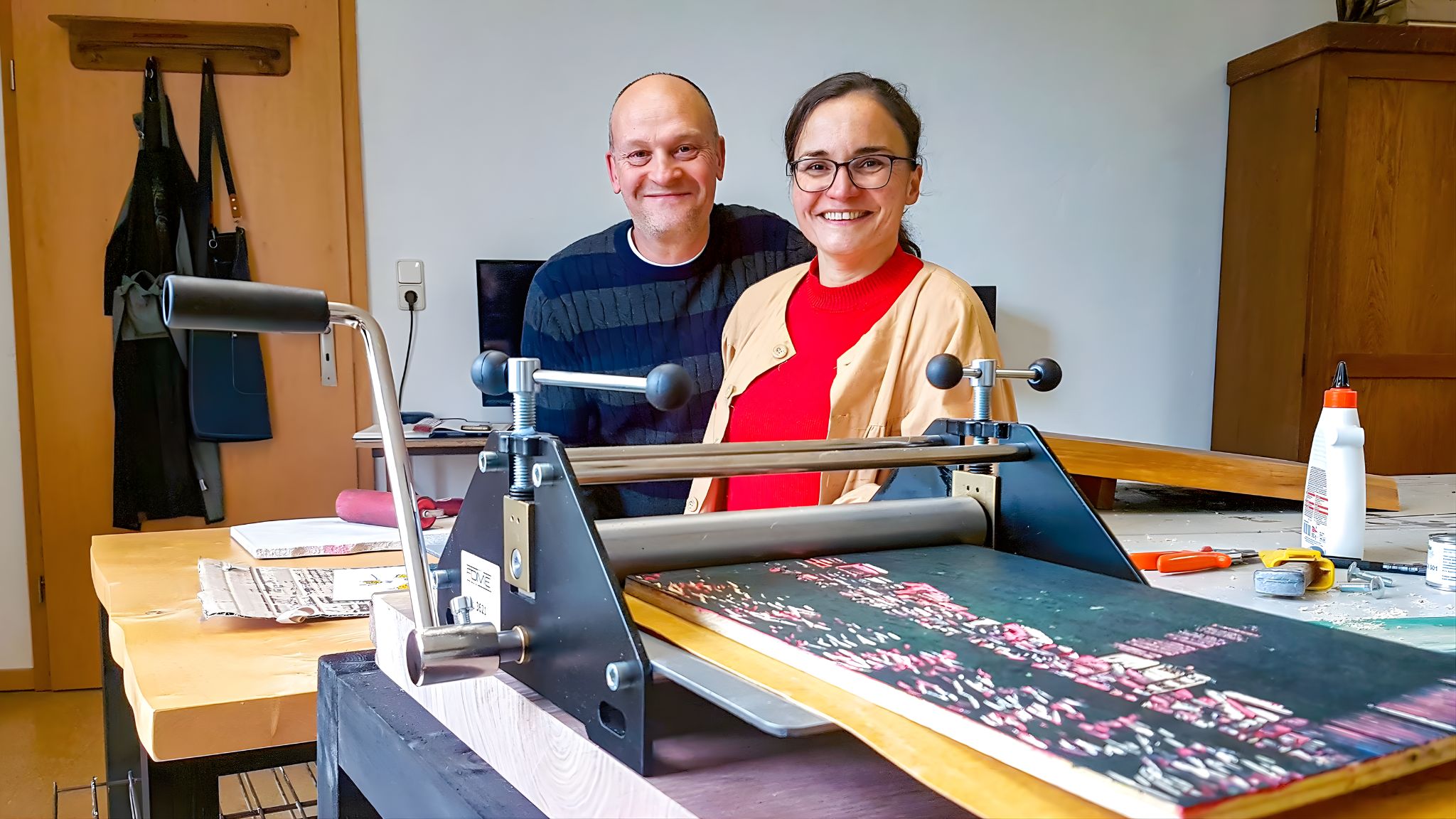 We were especially delighted to see a wonderful collaboration with our Managing Director Kerstin Rice and her husband Miles Rice, a talented designer-maker and special advisor to The ARCH, from Rittergut Schönberg come to life. Miles thoughtfully designed and built a magnificent, custom-made linocut printing station for the Kreismuseum Osterburg, while Kerstin, a dedicated printmaker, brought her expertise to the project.