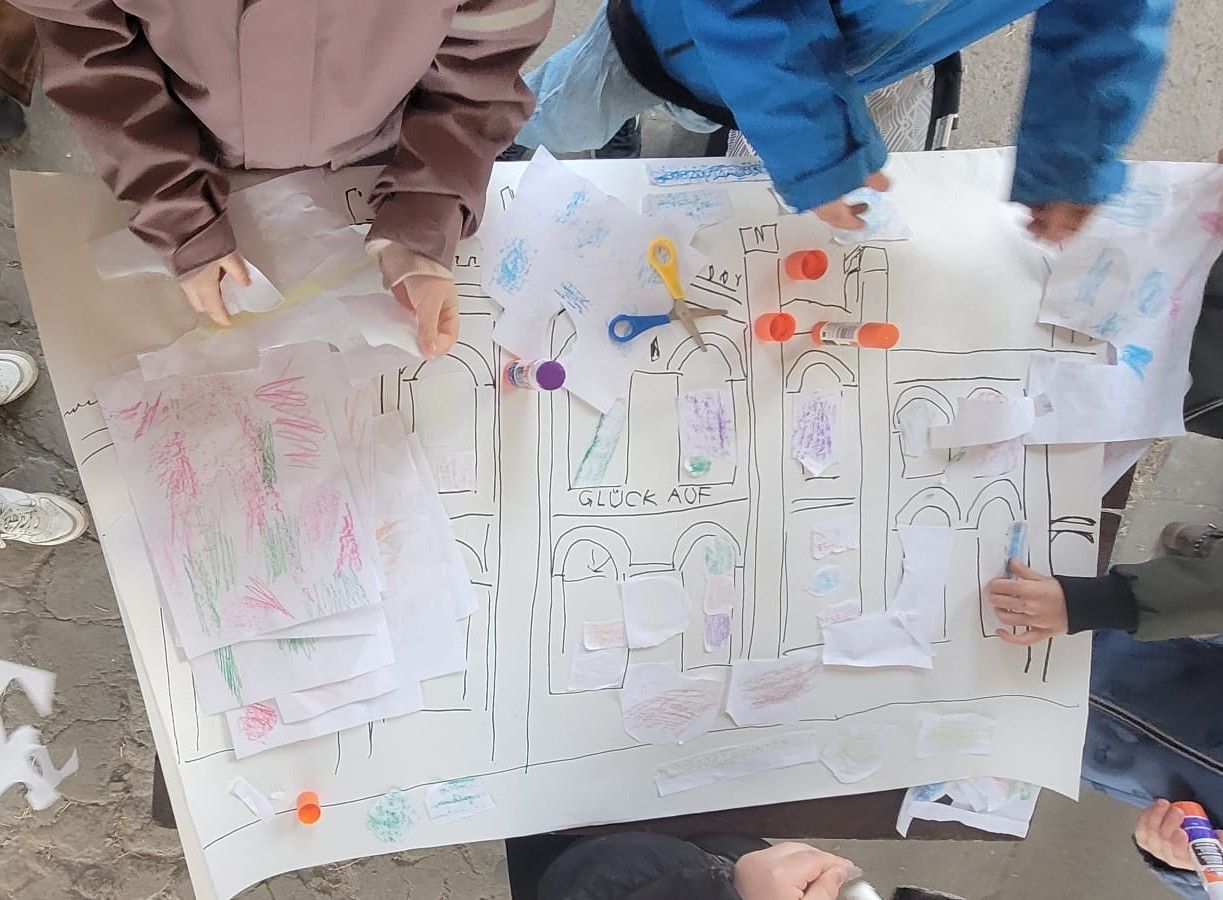 Ahead of the big day, during the Easter holidays, the Hortkinder (children from the local after-school care program) had already created impressive large-scale collages and banners depicting the old iron foundry halls and the New Castle, important landmarks that shape their city’s identity.